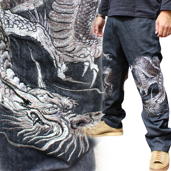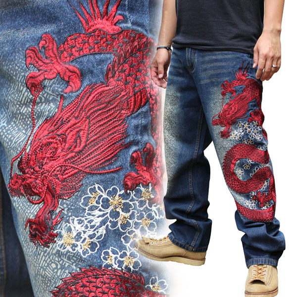 和柄 ジーンズ 和柄 デニム 和柄ジーンズ 和柄ジーパン【B220106】赤龍 和柄刺繍ジーンズ 和柄メンズ ボンタン特攻服