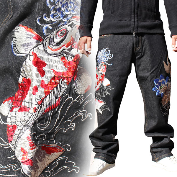 和柄 ジーンズ 和柄 デニム 和柄ジーンズ 和柄ジーパン【B220103】特大錦鯉! 和柄刺繍ジーンズ 和柄メンズ ボンタン特攻服